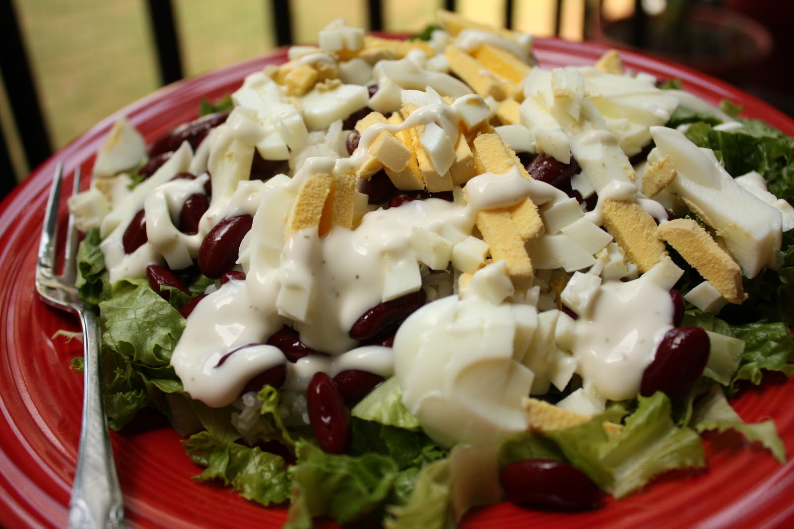 I love working so close to home that I can scoot home for lunch! Today I made a salad with some romaine that was about to go bad, leftover kidney beans, hard boiled eggs and a fresh batch of rice that is buried under there somewhere!