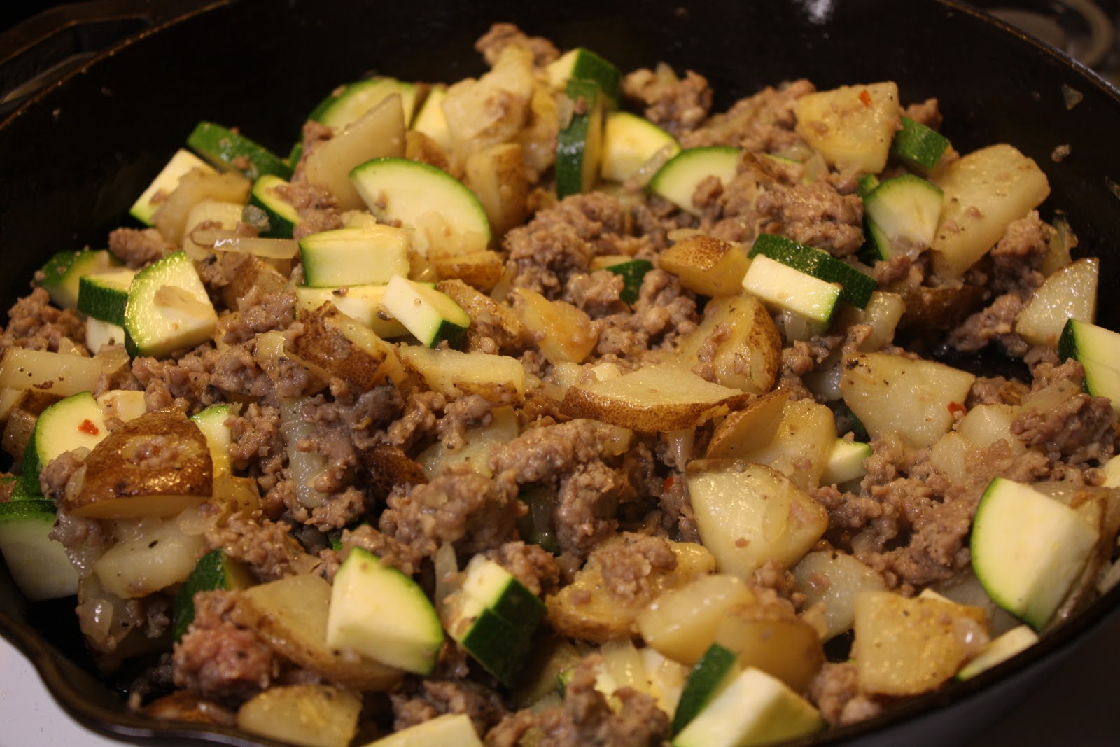 Once everything in your skillet is cooked, clear a hole in the middle, add a little bit more oil and throw in your four eggs (whisked together with some milk). Let them cook a little bit and then scramble them into the rest of the skillet.