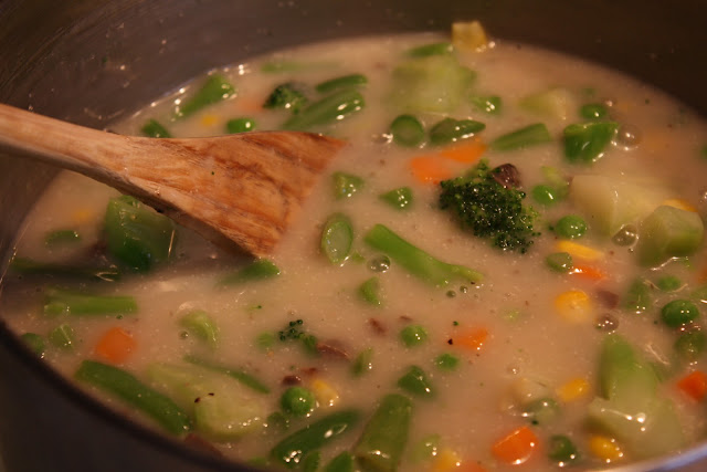 Once the soup is warm, add your veggies, give it a quick stir and cover them so they cook.